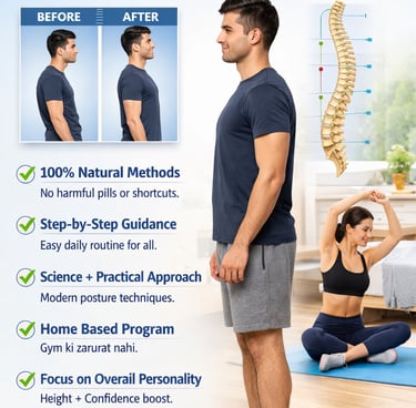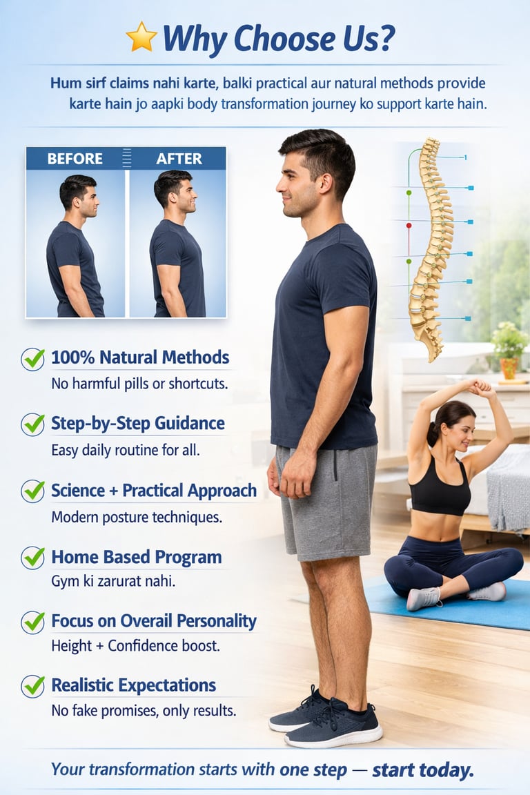 π 18 ke baad natural bone growth slow ho jati hai, lekin proper posture, stretching exercises aur lifestyle improvements se aap apni height ka appearance improve kar sakte ho.